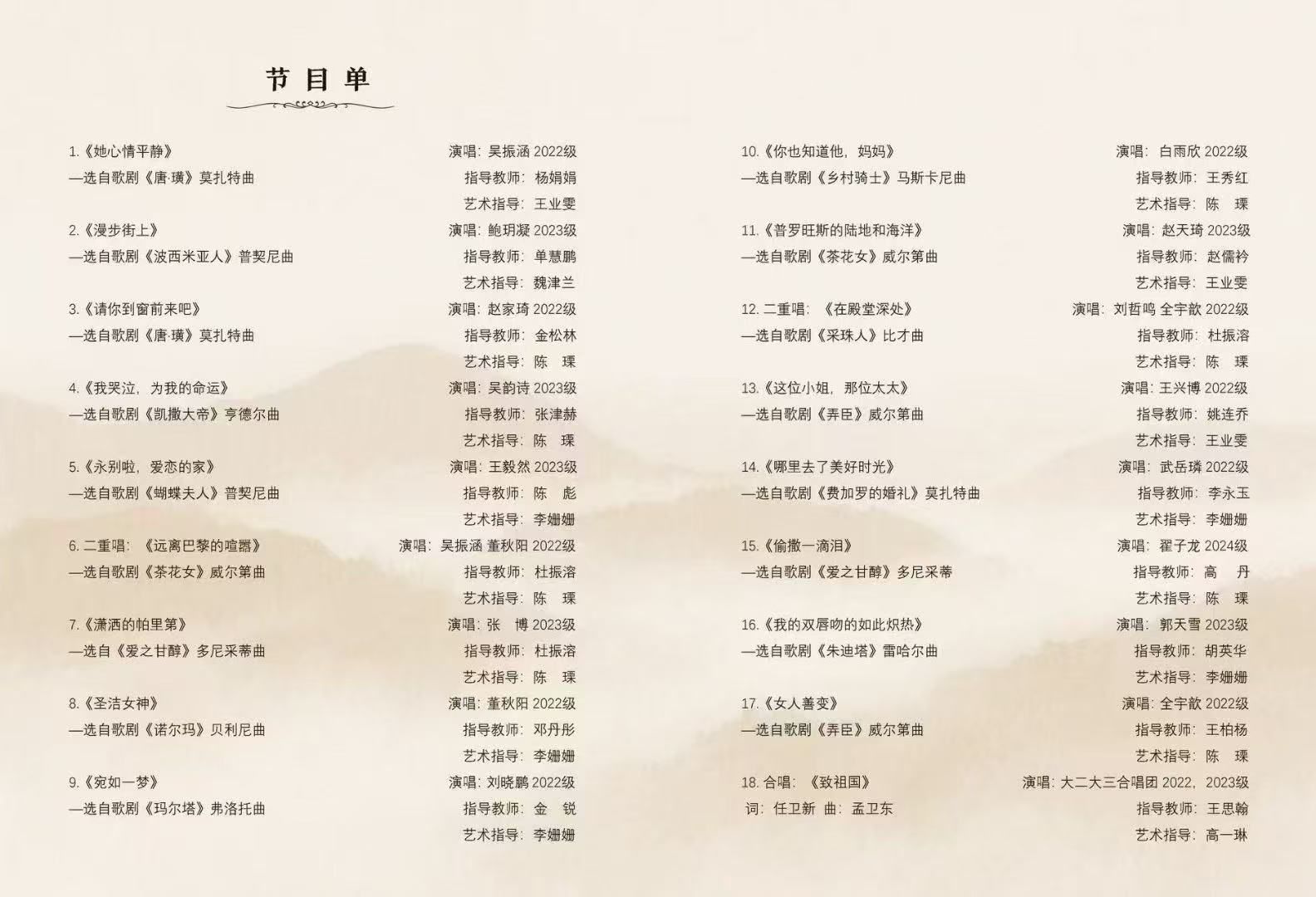 本场音乐会旨在为声乐学子搭建宝贵的艺术实践平台,检验其专业技能与艺术表现力,并展示教师的教学水平。音乐会精心遴选了18首涵盖了咏叹调、二重唱、以及合唱的声乐作品,形式丰富多样。2022级至2024级的优秀学子们依次登台,以饱满的热情和日渐成熟的技艺,倾情演绎了跨越时空的音乐瑰宝。
