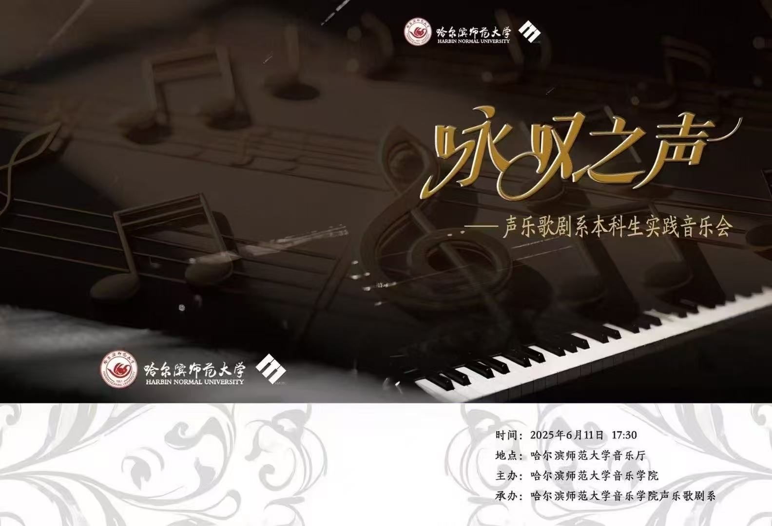 为充分展示声乐歌剧系本科生的专业风采与阶段性教学成果,在我校、院领导的亲切关怀与大力支持下,在声乐歌剧系全体教师的悉心指导与精心筹备下,“咏叹之声————声乐歌剧系本科生实践音乐会”于2025年6月11日晚17:30在哈尔滨师范大学江南音乐厅华彩上演,并取得圆满成功。