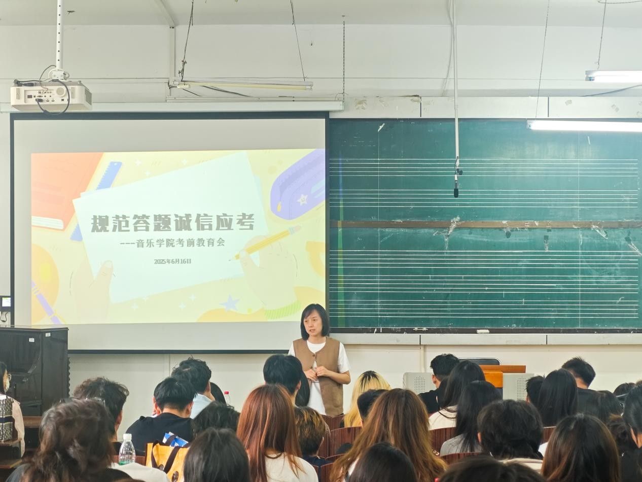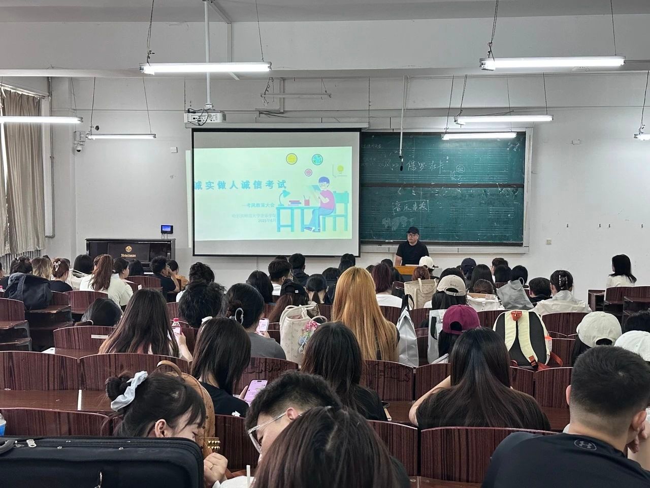 胡中辉在2023级音乐表演专业考风教育大会上为同学们详细解读《考试管理办法》相关规定,她强调考试纪律是不可触碰的红线,通过典型案例分析,警示同学们作弊行为将面临的严重后果,希望同学们严守纪律红线,以真实水平接受检验。