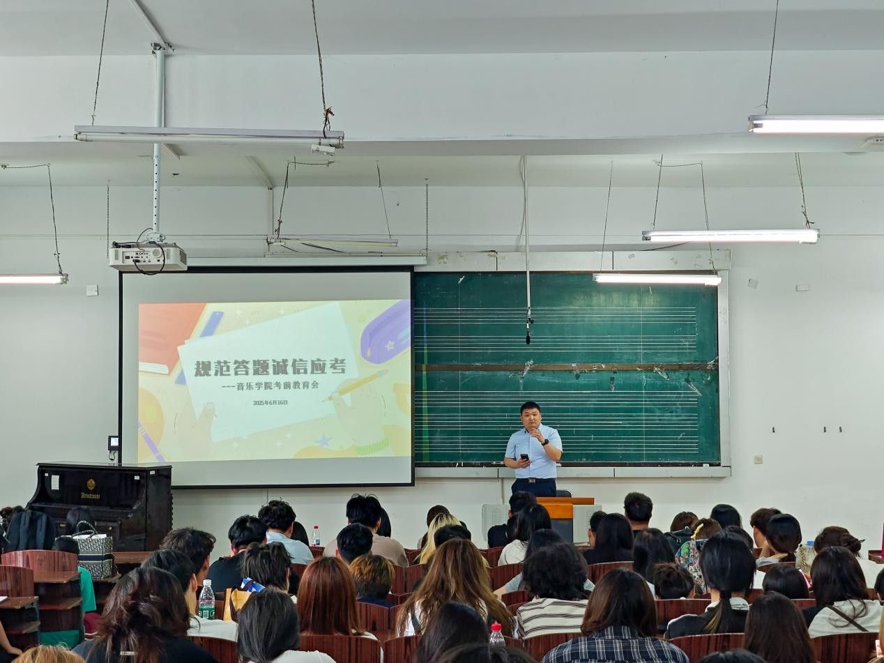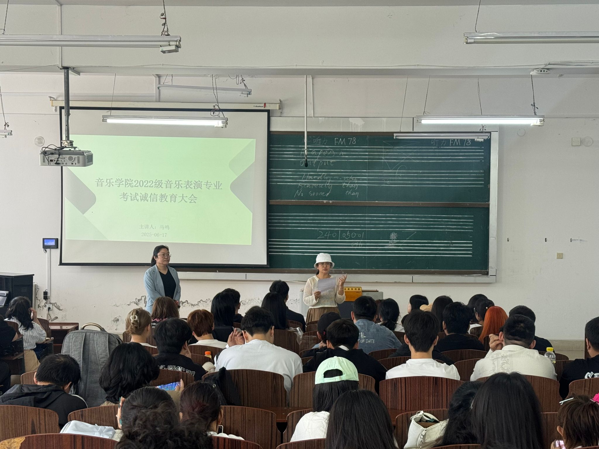 为深入推进学院学风建设,加强学生诚信意识、考试纪律和安全防范意识,音乐学院分层次召开学生考风教育大会,各年级辅导员老师主持会议,党委副书记周芳、副院长胡中辉、学院教学科研办公室老师崔文珺、李方越,学院全体学生参会。