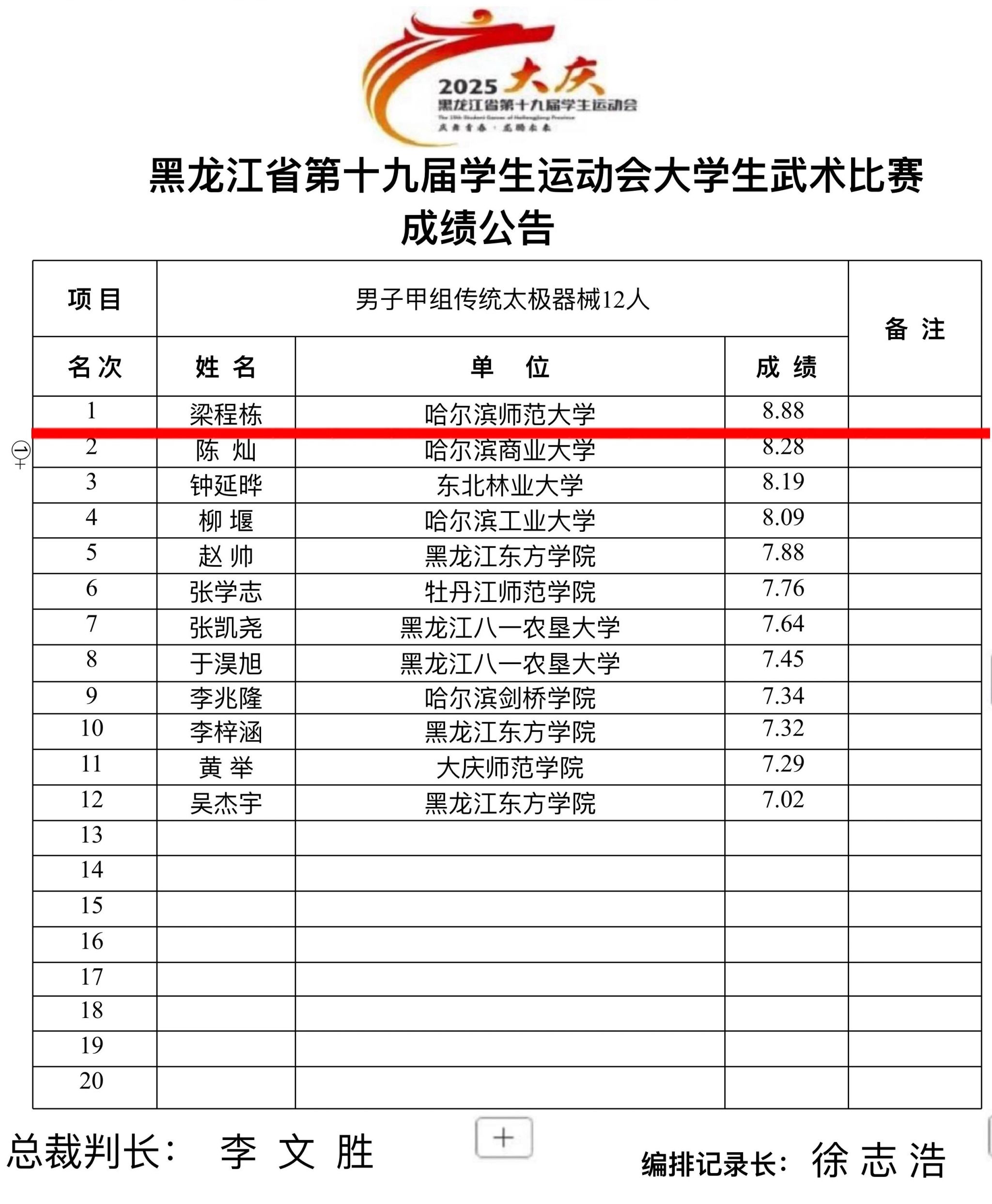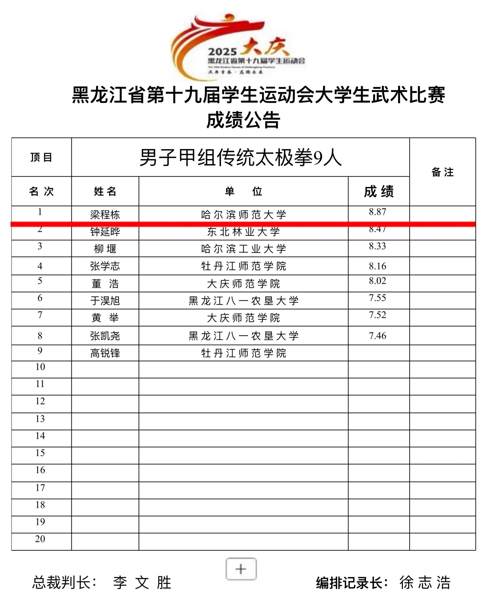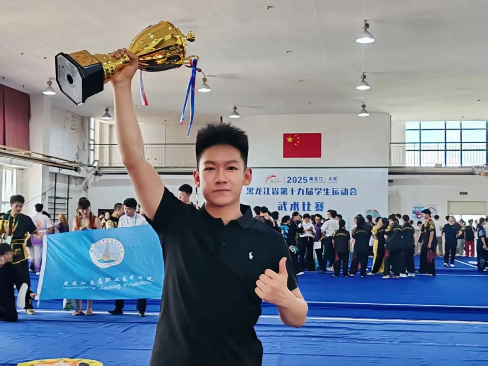 黑龙江省第十九届学生运动会是全省高校体育领域的一次盛会,汇聚了来自各高校的顶尖体育高手,竞争异常激烈。梁程栋同学在赛场上充分发挥自己的优势,展现出了极高的体育素养和竞技水平,最终,梁程栋同学荣获男子甲组传统太极拳第一名、男子甲组传统太极器械第一名的好成绩,为学校在本次比赛中取得的辉煌成绩贡献了自己的力量。