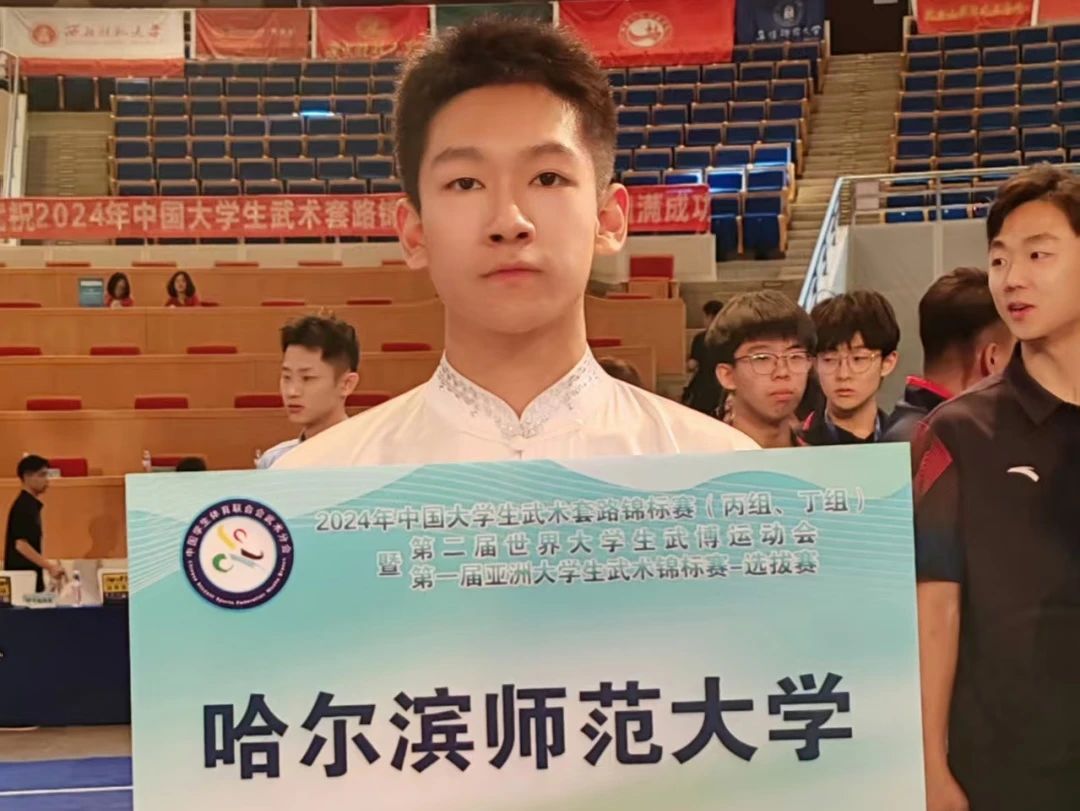 在刚刚落下帷幕的黑龙江省第十九届学生运动会武术比赛中,我院学生梁程栋,凭借深厚功底与顽强毅力,在众多选手中脱颖而出,为学校和学院赢得了荣誉,展现了哈师大学子的卓越风采!