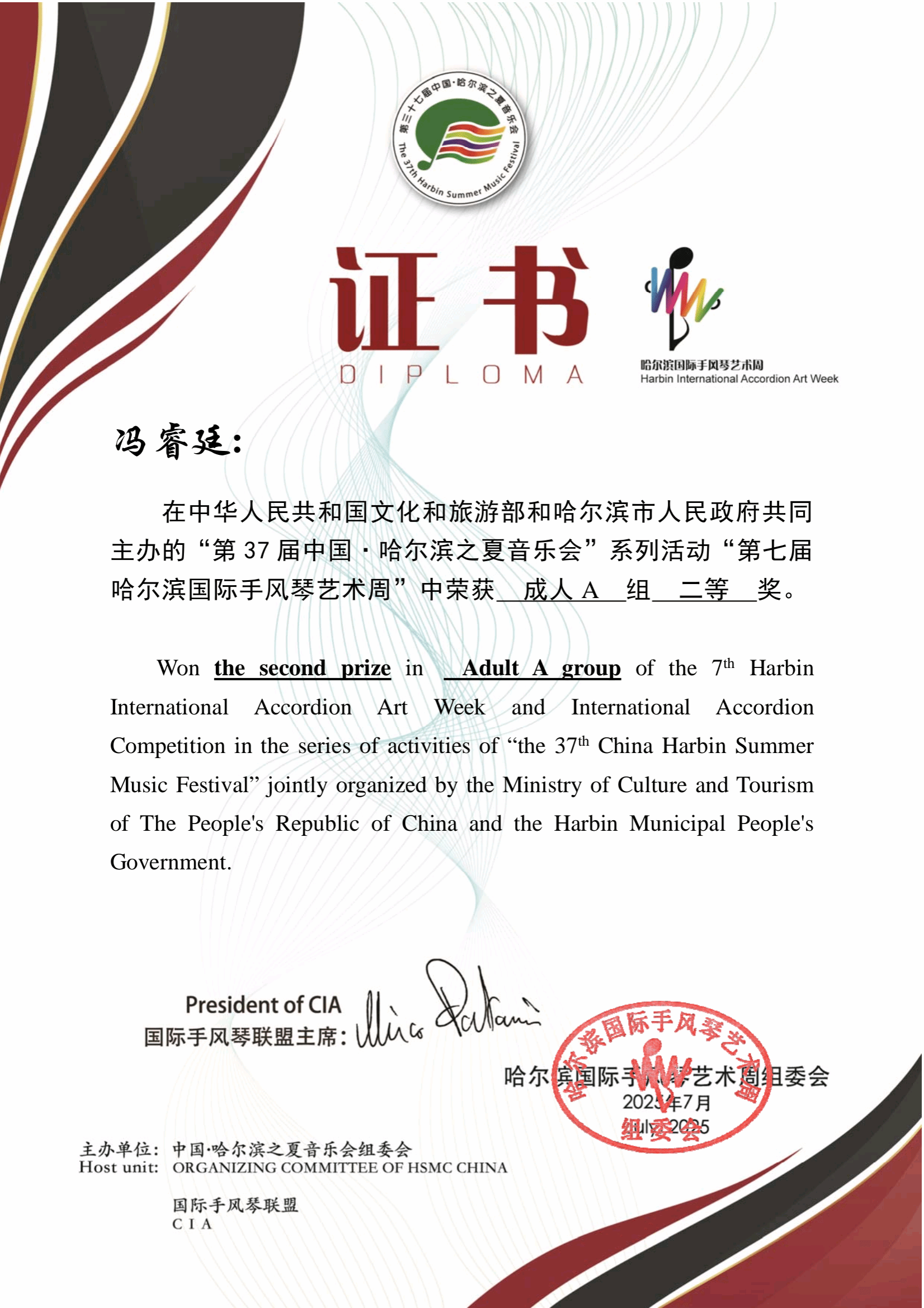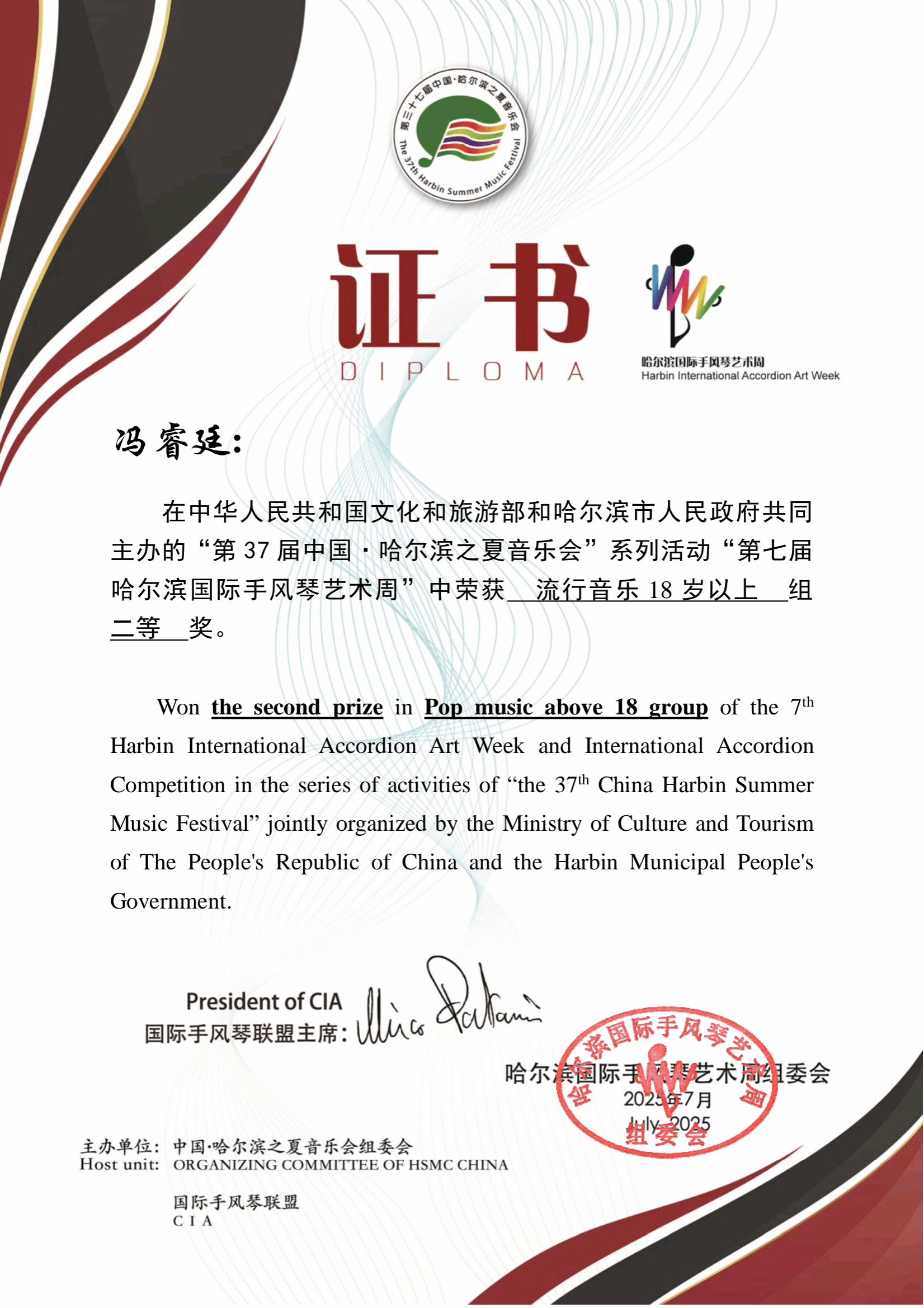 比赛中,冯睿廷凭借扎实的专业功底与灵动的舞台表现力,在多国高手同台竞技中脱颖而出,充分展现了我院手风琴专业的教学成果与学子的过硬实力。
