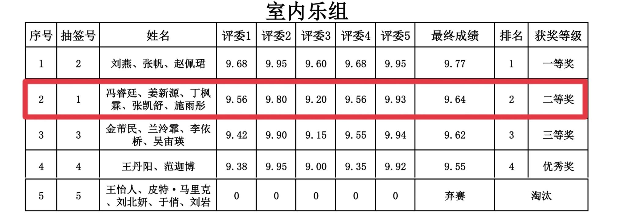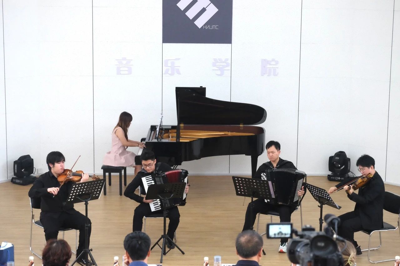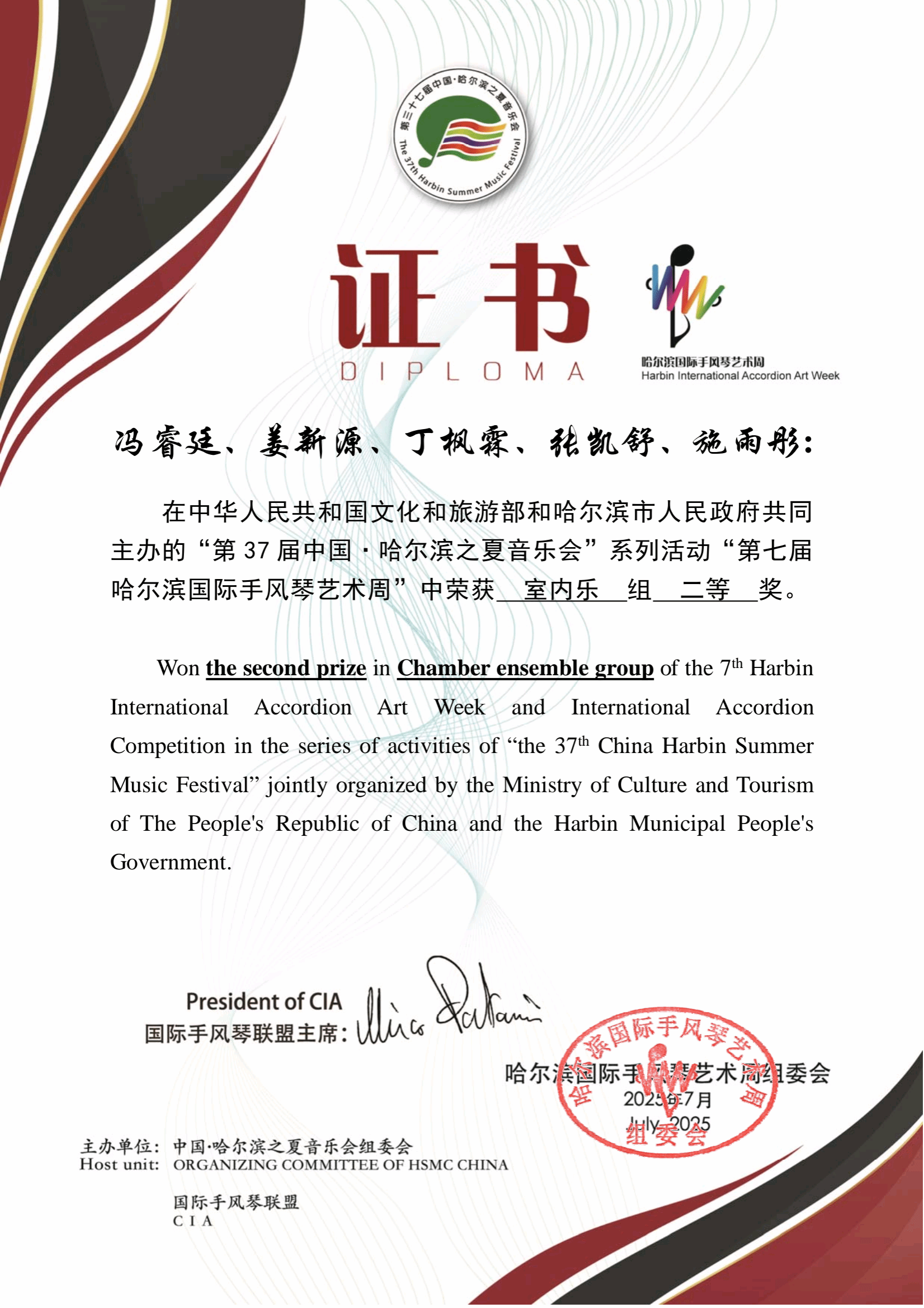 同时,由2023级器乐表演(手风琴)专业方向研究生冯睿廷、2022级键盘班(手风琴)姜新源、2022级键盘班(钢琴)施雨彤、2022级西洋管弦班(小提琴)丁枫霖、2023级西洋管弦班(小提琴)张凯舒组成的室内乐组合,凭借默契的配合与出色的演绎,荣获室内乐组二等奖(第二名)。指导教师王宏宇教授、徐国奇教授、何艺教授、吕欣副教授荣获优秀指导教师奖。