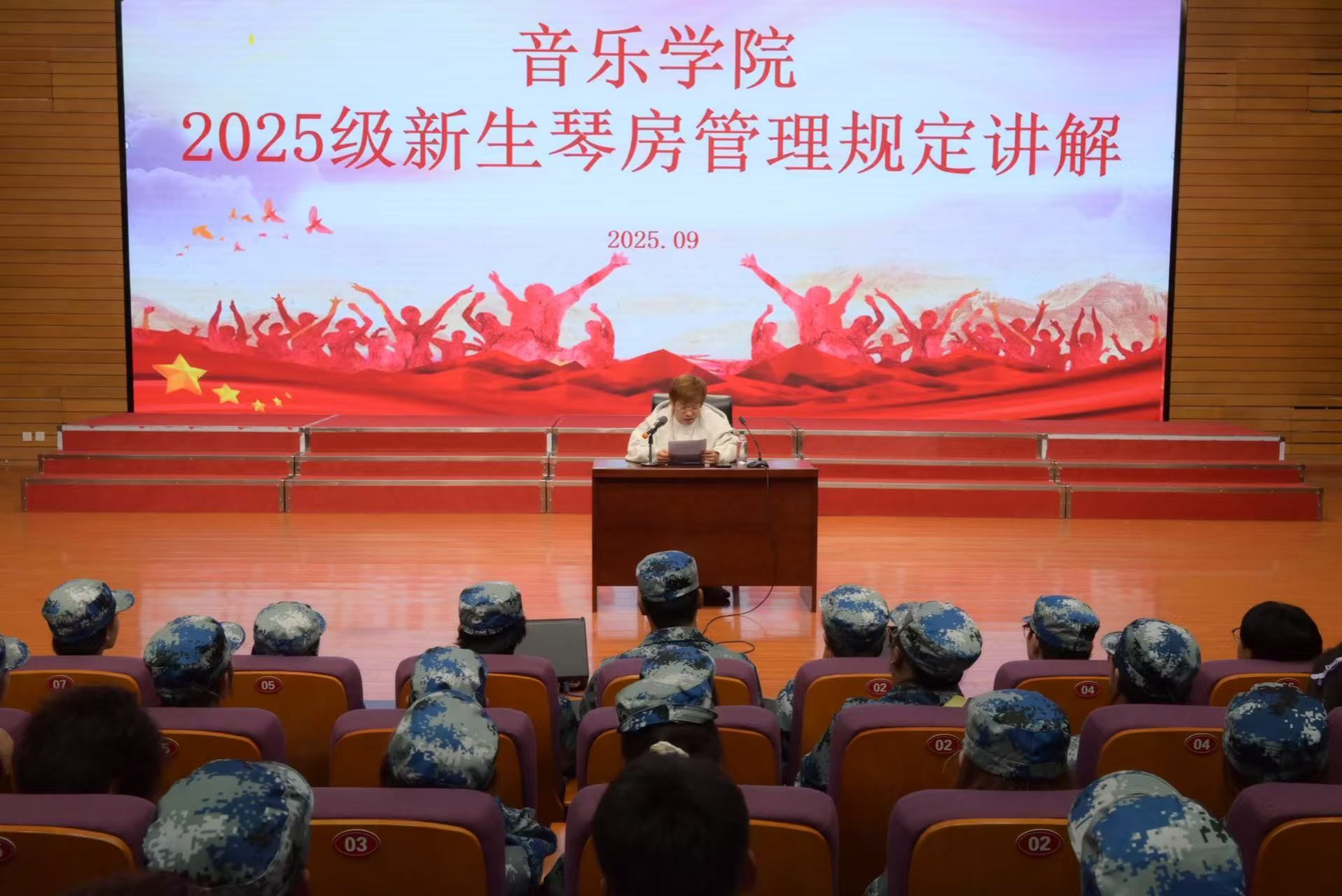 为进一步规范学院琴房的使用,2025年9月11日、12日,音乐学院召开了2025级新生琴房管理规定讲解会议,会议由院办赵明宇老师主讲,2025级全体新生参加了此次会议。