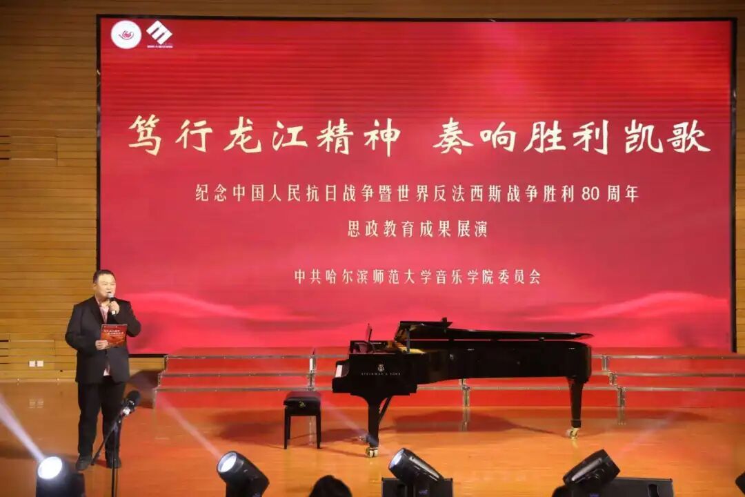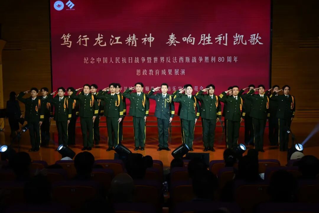 为纪念中国人民抗日战争暨世界反法西斯战争的英烈们,大力传承和弘扬以爱国主义为核心的龙江精神,创新推进大中小一体化思政育人实践,扎实推动思政教育走深走实,10月15日下午14:00,音乐学院在音乐厅成功举办“笃行龙江精神,奏响胜利凯歌——纪念中国人民抗日战争暨世界反法西斯战争胜利80周年思政教育成果展演”。校党委常委、副校长尹剑锋、徐国峰,校党委常委、纪委书记、省监委驻哈尔滨师范大学监察专员赵洪斌,校党委常委、宣传部部长张艳君,校党委常委、统战部部长宿建,相关职能部门负责人和部分学院党委书记,黑龙江省妇女儿童发展中心副主任教授全红霞,音乐学院全体领导班子成员及师生代表300余人到场观看。