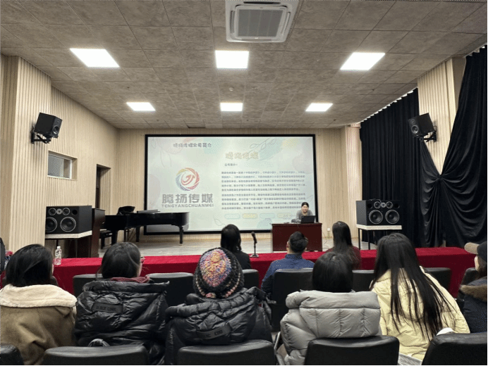 招聘会伊始,邹昊成董事长向在场学生介绍了公司的文化理念与发展战略。他表示,腾扬文化始终以“挖掘潜能、陪伴成长”为核心,重视每一位人才的独特性与创造力,希望通过此次校园招聘,吸纳更多有专业素养、有舞台热情的音乐新锐,共同参与打造黑龙江本土演艺生态。李沁怡总经理则从业务实践角度,详细阐述了公司目前开展的多项人才培养计划、赛事运营体系及职业晋升机制,强调公司将为新人提供从培训、实践到市场化运营的全链路支持。袁明经理针对招聘岗位的具体要求、薪酬结构、福利保障及应聘流程作了系统说明,在场学生积极提问,围绕行业趋势、能力要求等话题展开讨论,气氛热烈,让大家对未来职业发展有了更具象的认知。