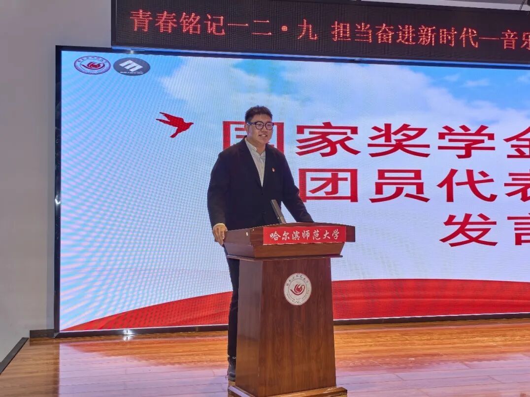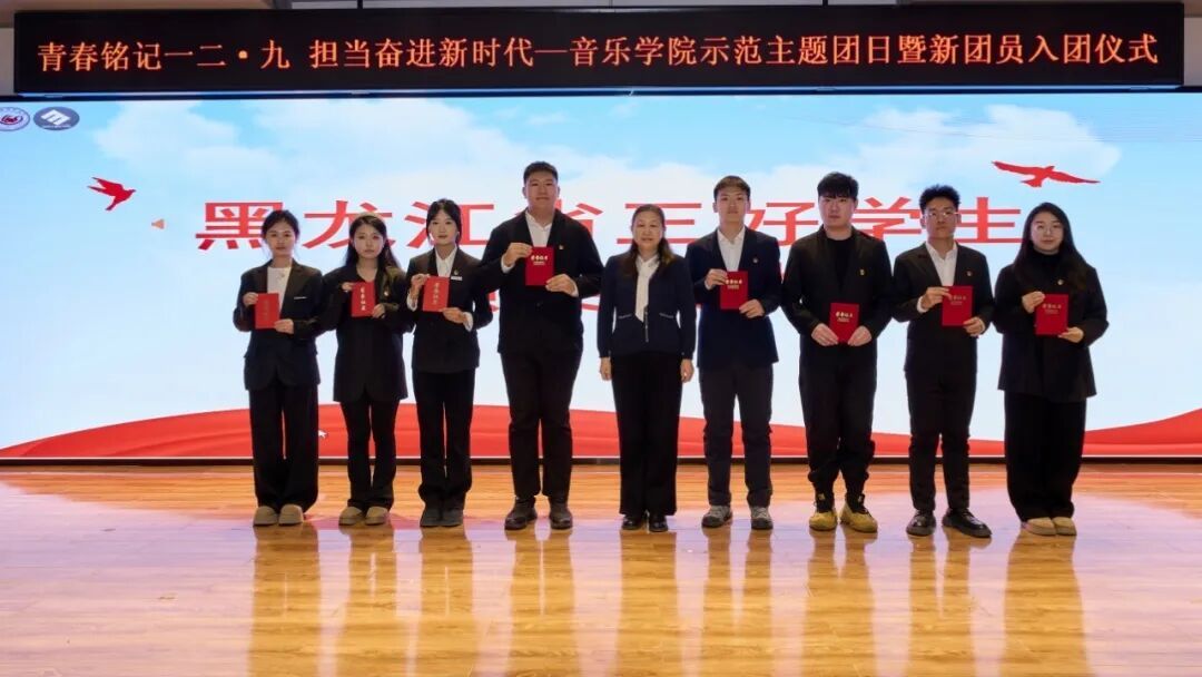 “青春铭记一二・九,担当奋进新时代”示范主题团日活动,既回望峥嵘岁月,又锚定时代坐标。乐器重奏《万疆》、爱国诗朗诵《北大荒人的歌》、诗与歌《如愿》、歌曲《我爱你中国》生动展现出音乐学院青年以青春之声传爱国情怀、勇担时代使命、不负青春韶华的精神风貌,更以实际行动诠释着“敦品励学,弘毅致远”的哈师大校训内涵。通过表彰2024-2025学年国家奖学金、黑龙江省普通高等学校“三好学生”、2024-2025学年校三好学生、优秀学生干部和2025年暑期“三下乡”社会实践活动获奖代表和先进典型,发挥榜样引领作用。