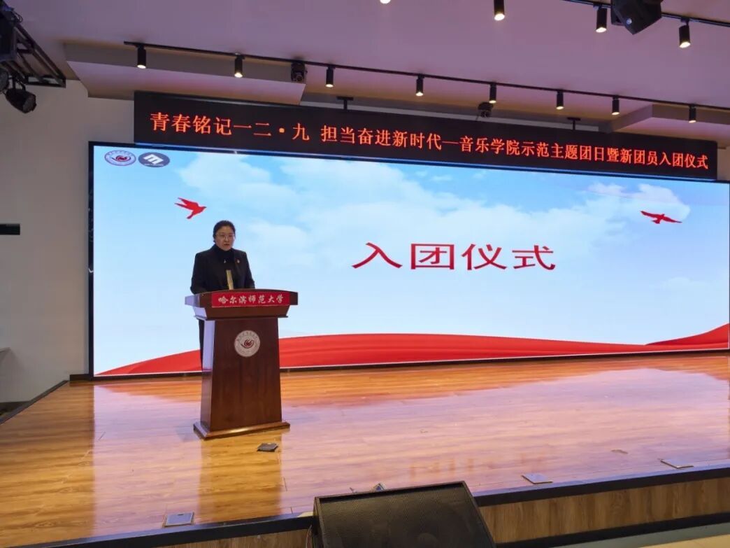 为深入贯彻落实党的二十届四中全会精神,坚持党建带团建激活青春“新动能”,纪念“一二·九”运动九十周年,深切缅怀挺身而出的爱国先驱,引导团员青年在红色历史中汲取奋进力量,表彰我院学生先进集体和个人,树立和宣传青春榜样,12月9日下午,音乐学院在双创园二楼报告厅举行“青春铭记一二·九,担当奋进新时代——示范主题团日暨新团员入团仪式”。学院党委书记范晓丹、党委副书记周芳、全体辅导员老师、获奖者代表、全体新团员、学生代表参加仪式。