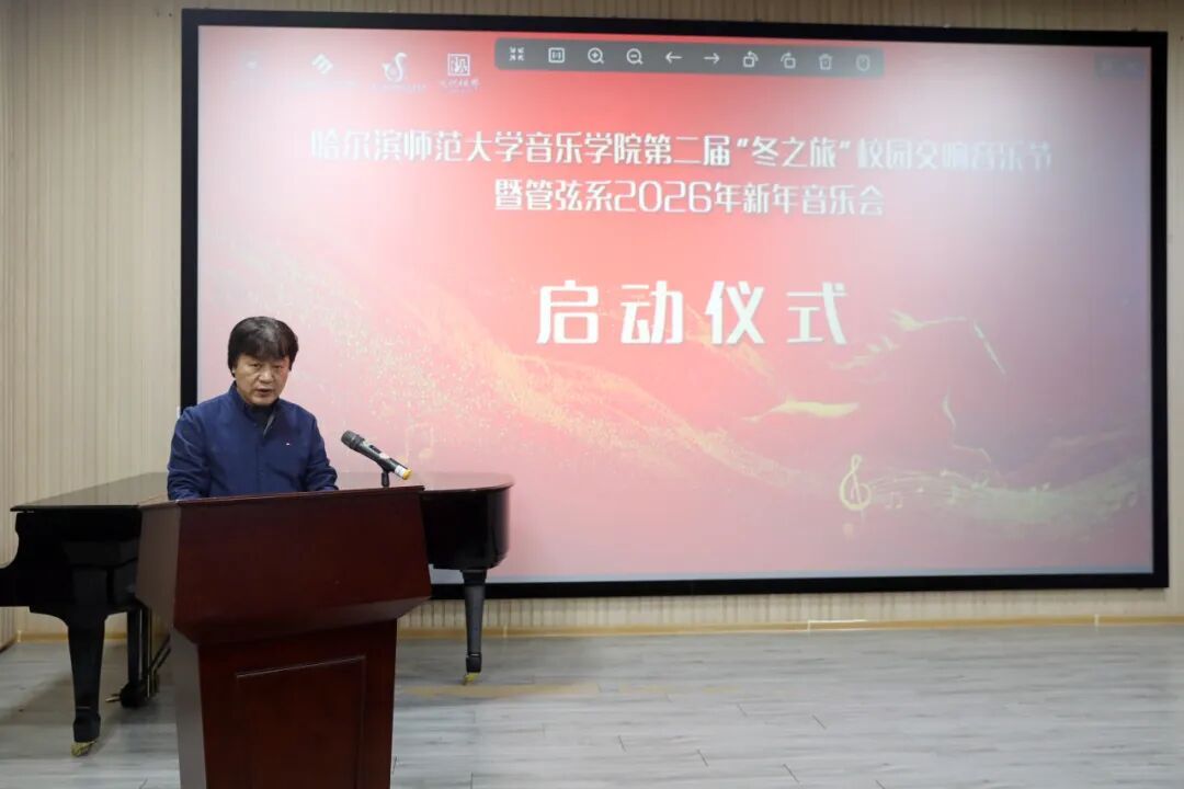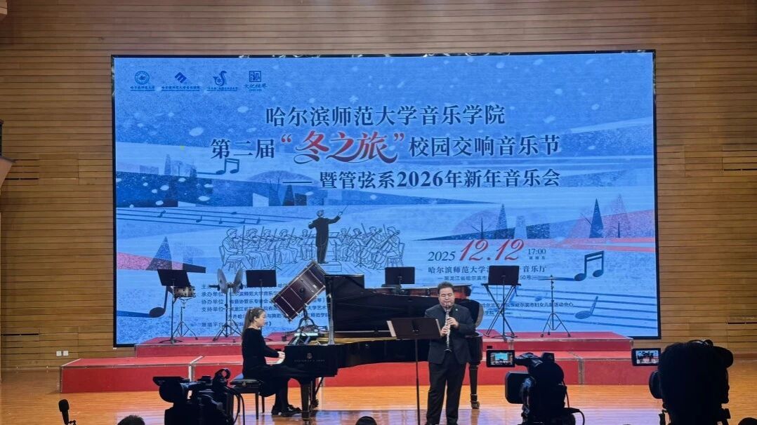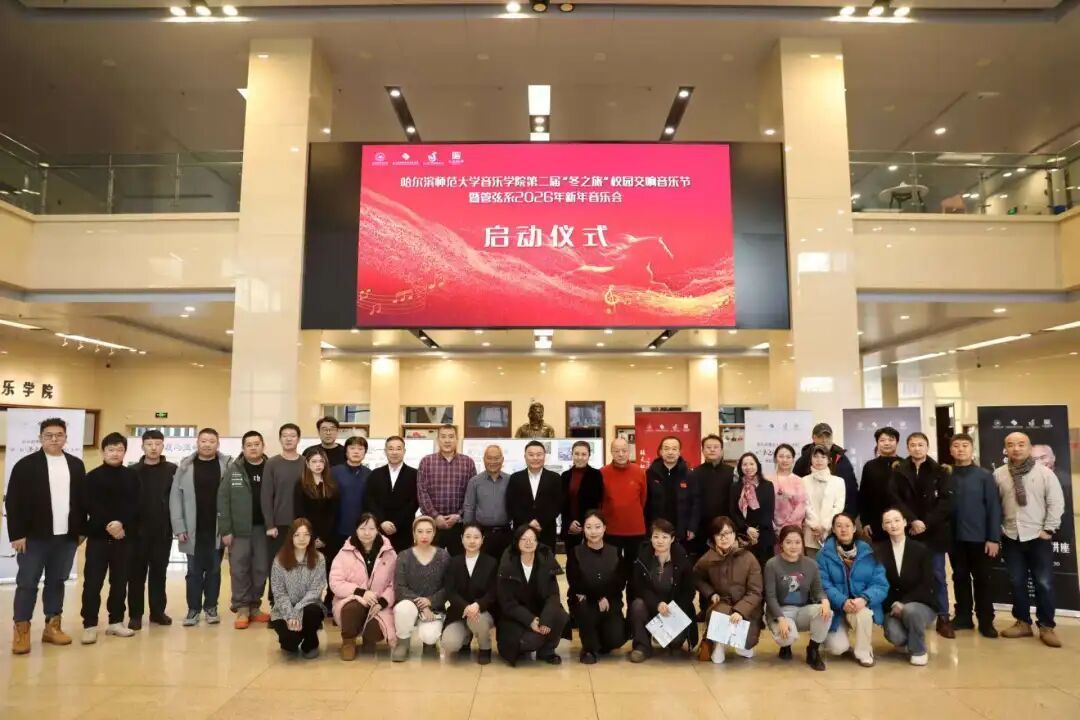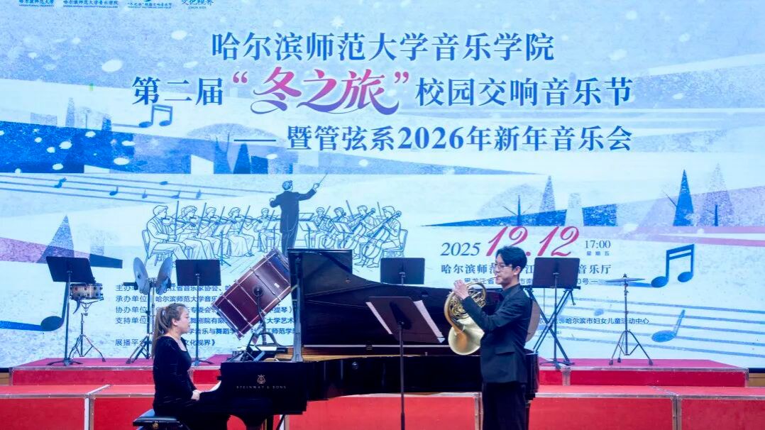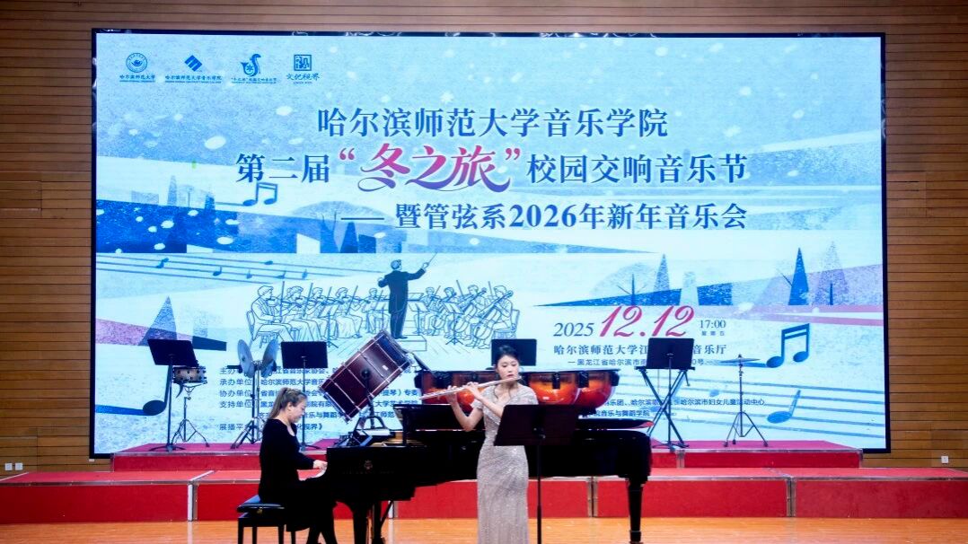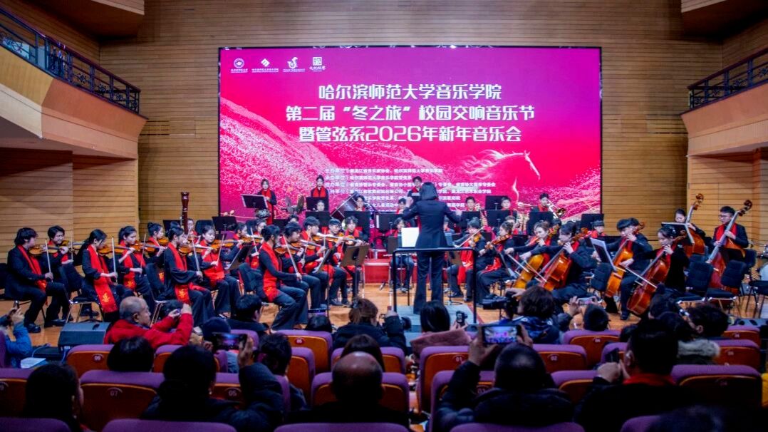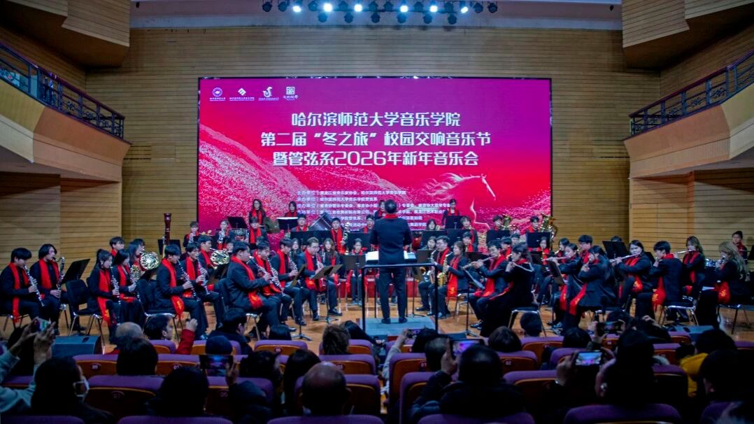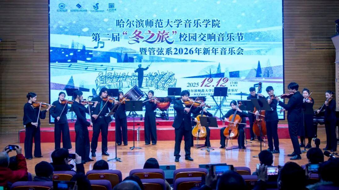乐韵悠扬迎冬序,管弦和鸣启新章。为深入贯彻党的二十大及二十届四中全会精神,扎实推进校园文化建设与美育强国建设,切实履行高校音乐教育服务哈尔滨“音乐之城”建设的核心使命,2025年12月12日17:00,哈尔滨师范大学江南校区音乐厅内华灯璀璨、宾客盈门、暖意融融。第二届“冬之旅”校园交响音乐节暨管弦系2026年新年音乐会在此奏响华美乐章,以专业的艺术呈现为在场师生与嘉宾献上一场浸润心灵的文化盛宴,为冰城的冬日注入炽热的艺术暖流。