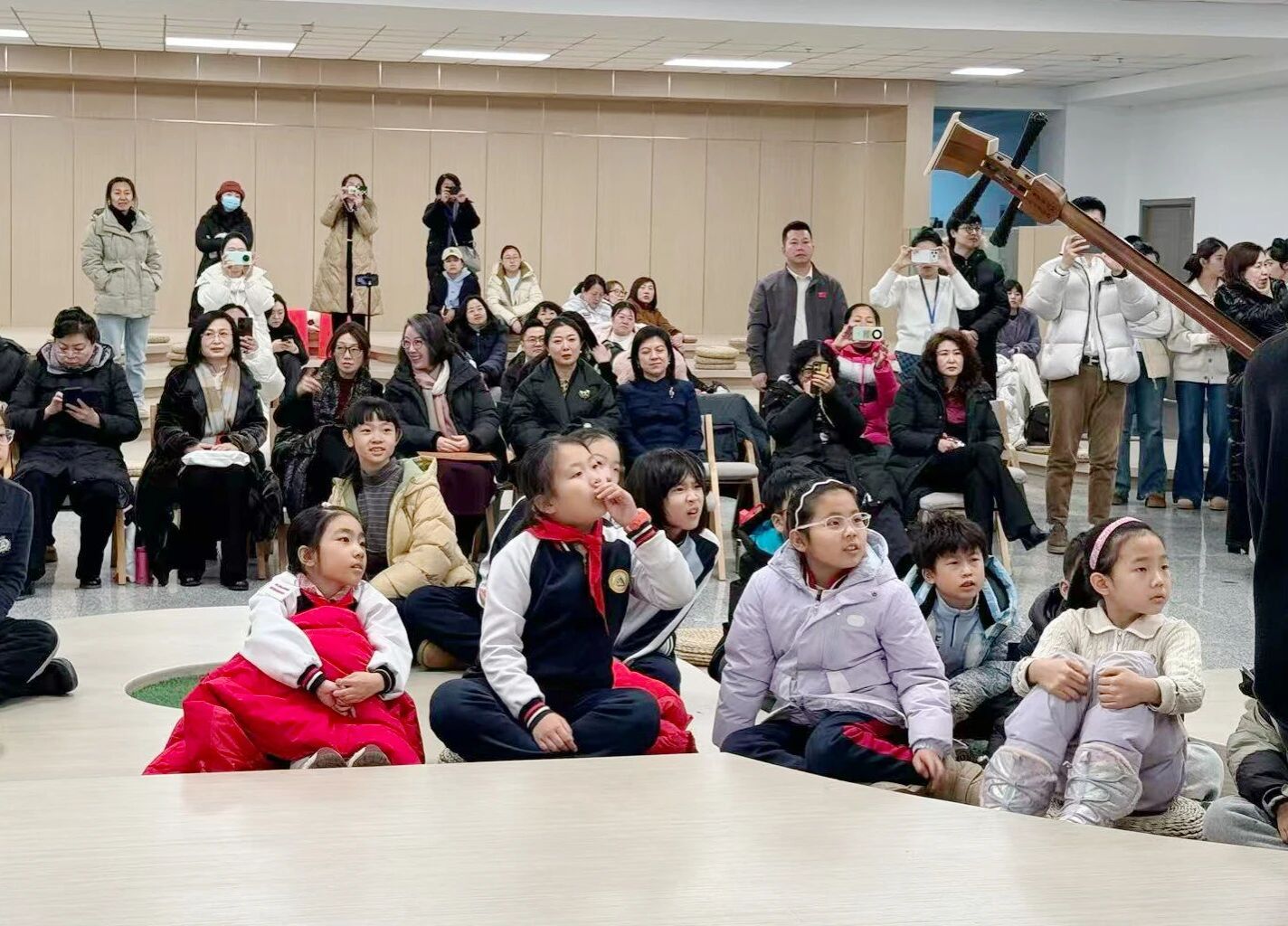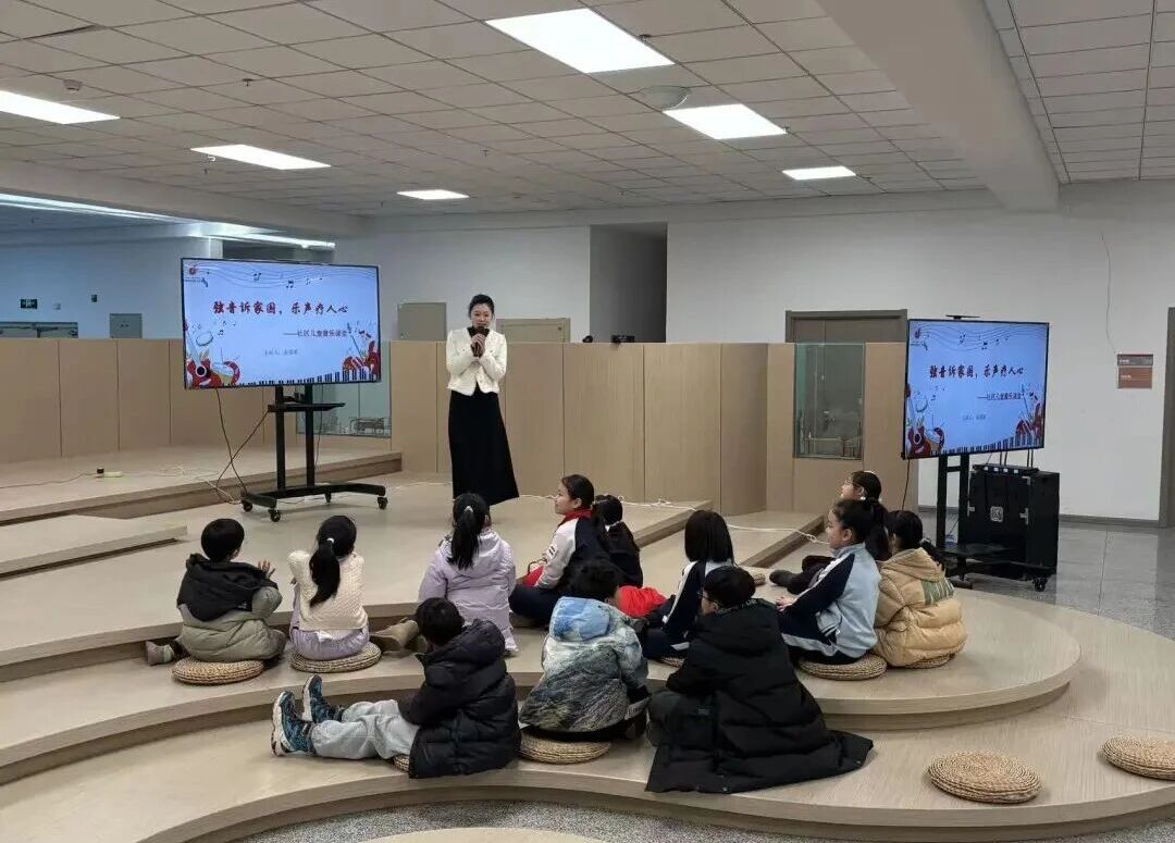启动仪式后,“黑土红音·心聆共育”社区公益课堂展示活动精彩上演。哈尔滨师范大学心聆工作室的志愿者们与文兴社区的小朋友们携手,带来了一场兼具美育与红色教育的视听盛宴。民乐合奏《上春山》奏响乡土韵律,志愿者们引导小朋友认识古筝、中阮、竹笛等乐器,辨析音色、亲手体验,在互动中传递传统音乐魅力;弦乐《红星闪闪》、《乌苏里江》旋律悠扬,前者饱含红色情怀,后者融入黑龙江地域文化与赫哲族特色,小朋友们一边聆听音乐,一边用画笔描绘心中的家乡美景;《虫儿飞》、《小星星》的互动环节中,志愿者手把手教孩子们使用甩琴、小乐器,在欢快节奏中感受音乐乐趣;最终,活动在大合唱《我和我的祖国》中落下帷幕,大人与孩子携手同唱,红色基因与爱国情怀在歌声中传递,充分展现了家校社共育的温暖力量。