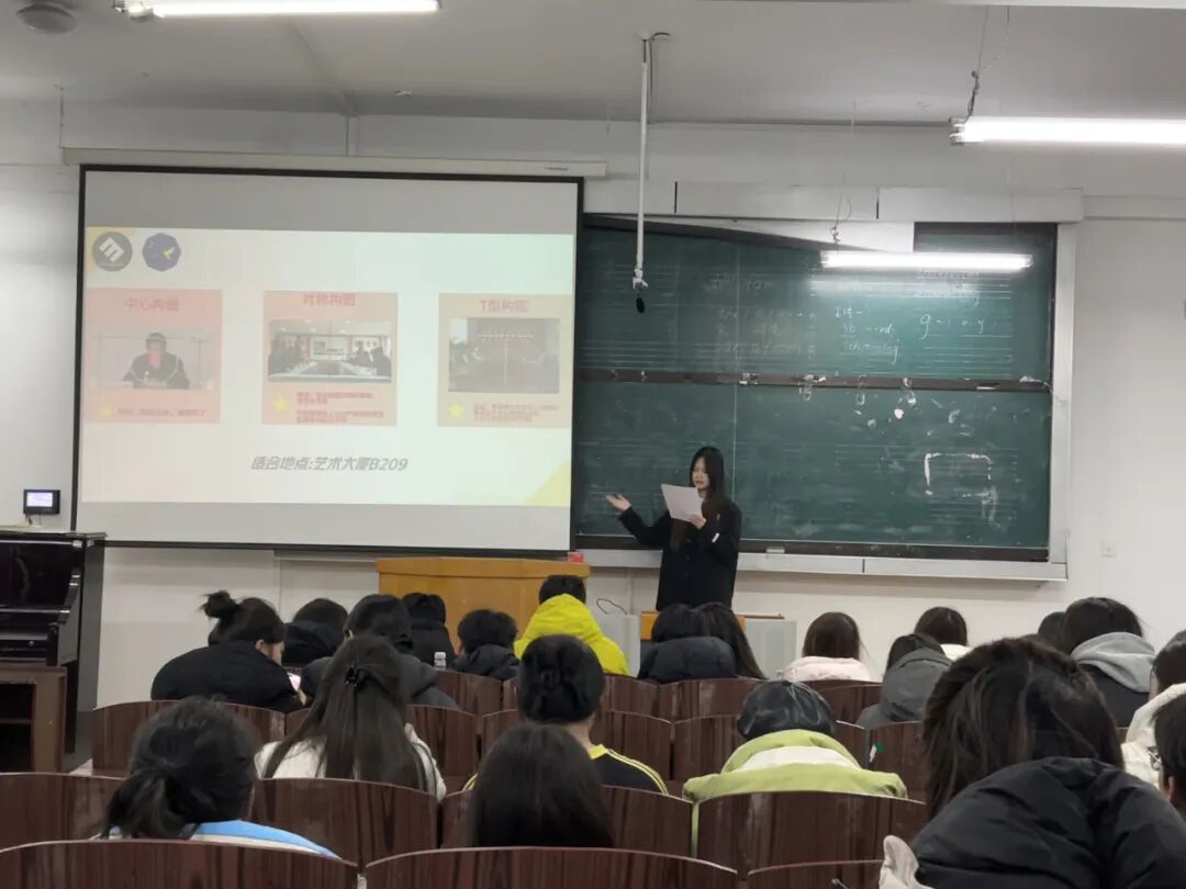 交流过程中,周雪结合自身丰富的实践经验,以“认知—实操—优化”为脉络,向在场同学分享了活动拍摄的实用技巧。她首先明确了拍摄“服务宣传推广、留存活动资料”的核心价值定位,为后续技巧分享奠定方向;随后围绕中心构图、对称构图等实用方法展开讲解,结合校园文艺活动特点,详细拆解了手机参数设置要点,以及演出抓拍、会场全景、细节特写等不同场景的拍摄逻辑;针对人物动态抓拍、集体照排列站位等易忽略的细节,她分享了实操性极强的小技巧,帮助大家提升成片质量。在后期处理环节,周雪重点讲解了选片筛选、基础修图、格式适配等关键步骤,同时强调了拍摄前的沟通准备、现场分工配合等团队协作要点,助力学生组织提升活动记录的整体效率。整个分享过程摒弃晦涩专业术语,紧密结合学院文艺活动、汇演赛事等实际场景,让理论知识更易理解、更易落地,有效满足推送制作、视频剪辑、资料留存等多方面需求。