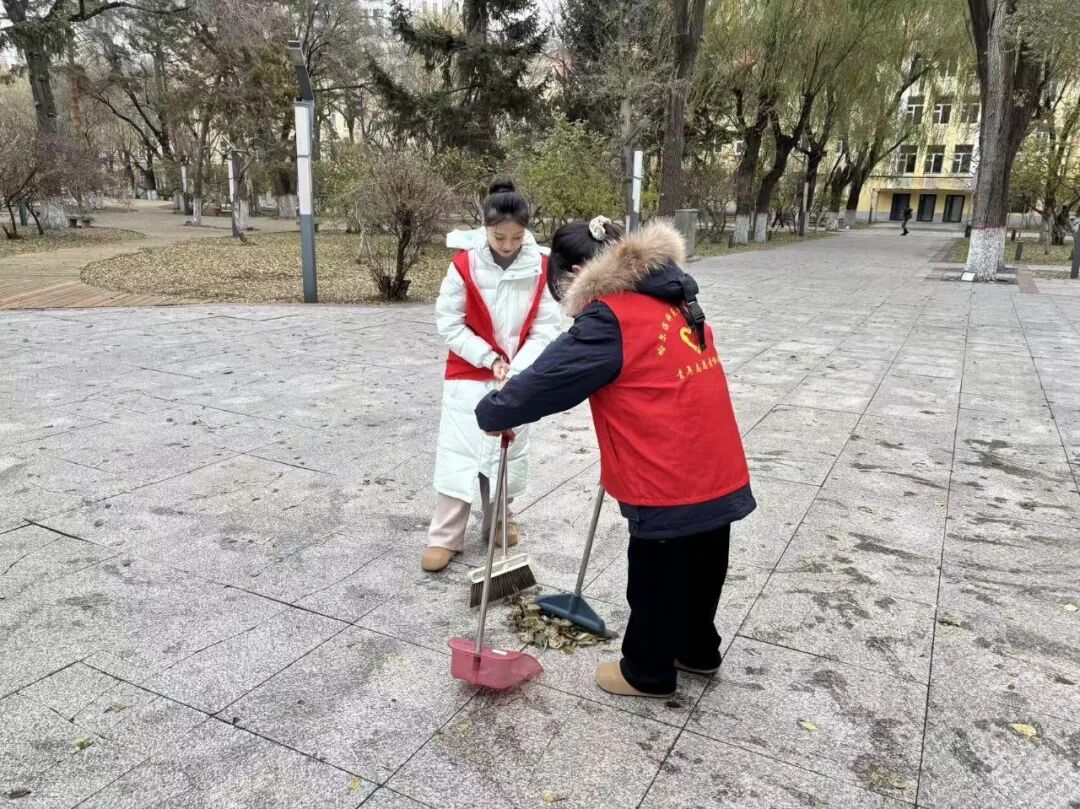 落叶虽为校园披上了浪漫的“金纱”,但堆积在道路、草坪上的叶片,不仅破坏了校园环境的整洁度,更给师生出行带来滑倒的安全风险。志愿者们对林荫道落叶进行了全面清扫,过程中,同学们相互配合、分工有序。他们手持工具,干劲十足,每一次清扫都细致处理着卡缝的落叶,将散落的秋意温柔归置。虽有辛劳,却也从劳动里体会到了实践的乐趣,更懂了尊重劳动、珍惜成果的意义。每一处角落都留下了他们弯腰劳作的身影,成为秋日校园里一道亮眼的风景线。