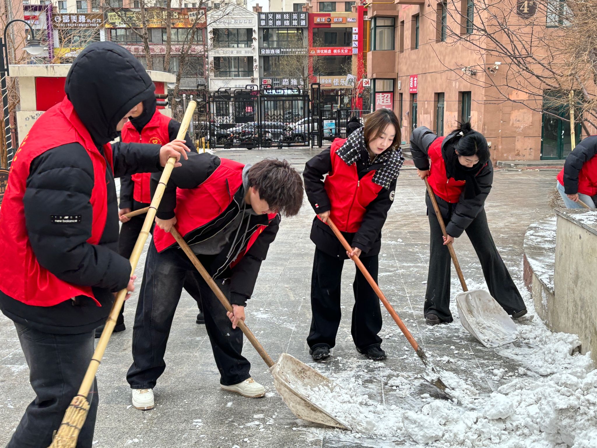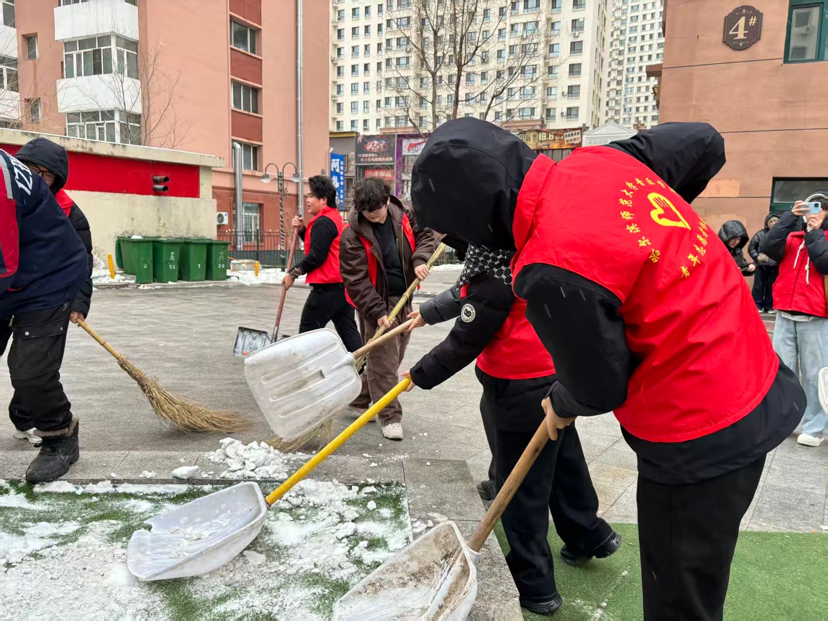 本次活动由何雨宣,张悦带队,与15名音乐学院志愿者前往和兴路街道学府经典社区党群服务中心,开展环境整治工作。到达现场后,大家迅速分工,有的拿起铁锹负责破冰铲雪;有的手拿扫帚紧随其后,顺着道路扫清残余的积雪与碎冰,确保路面无打滑的隐患。尽管天气寒冷,手指冻的通红,但志愿者们依旧热情满满,在额头的汗珠与呼出的白气交织下,努力清理道路积雪,同时将路边垃圾逐一收拾干净。通过大家的不懈努力与默契配合下,积雪清除后的路面干净整洁,路边的杂物也尽数消失。这不仅消除了出行的安全隐患,也让居民的生活环境更舒心,切实提升了居民的幸福感与安全感。