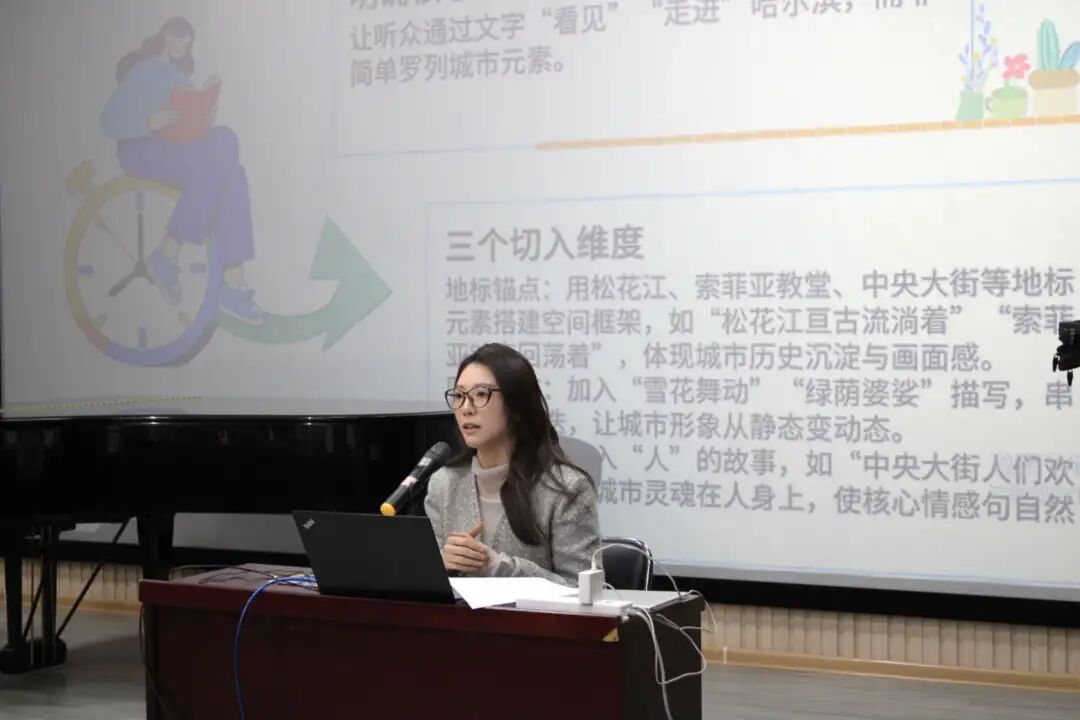 宋冰冰老师以《欢乐尔滨》创作历程与心得为主题展开分享。在歌词创作方面,她强调要摒弃简单罗列城市元素的做法,核心是用文字为听众构建哈尔滨的鲜活画面并融入真情实感:借地标建筑勾勒城市历史底蕴,以四季动态展现城市形象变迁,靠人文故事赋予城市独特灵魂。谈及旋律创作,她介绍歌曲以朗朗上口为风格导向,经反复推敲将速度定为100,以凸显轻松活泼的氛围;副歌旋律采用“重复+递进”的设计,既加深听众记忆,又推动情感层层升温。编曲环节,通过竹笛、吉他等乐器巧妙的融合,让作品呈现出传统与现代交织的鲜明特色。最后,宋老师分享创作心得:创作需立足真实观察与感受,避免内容空洞无物;要善用重复等手法打造记忆点;同时学会取舍、拒绝贪多求全,确保核心内容突出。整堂课不仅让大家清晰掌握了《欢乐尔滨》的创作逻辑,更收获了极具借鉴价值的创作方法。