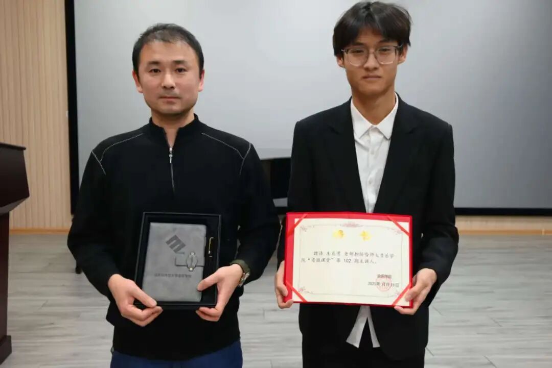 讲座结束后,新媒体中心新闻部赵奕博为王肖男老师颁发“音微课堂”第102期主讲的荣誉证书。